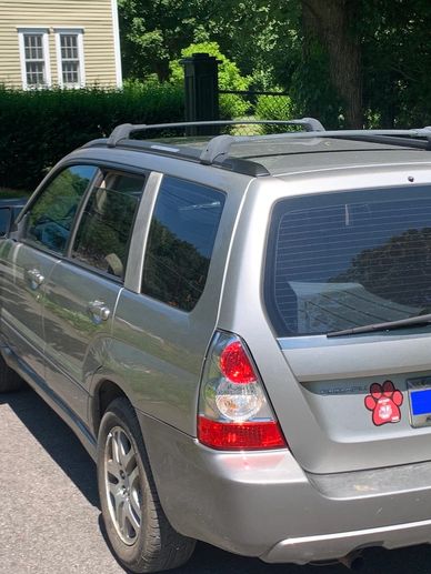 Trusty Subaru Forester is ChillyDoggy PosterPup 'Cuda's daily driver. Light color and dark-tinted windows make it fairly resistant to solar radiation, but like any other metal box, inside temperatures climb quickly under the rising sun...
